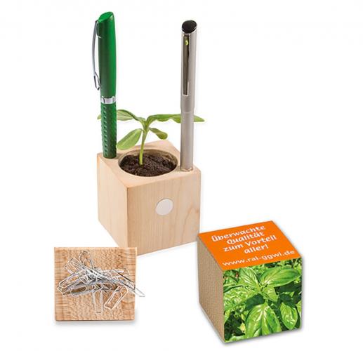 Blumentopf aus Holz mit Stiftehalter inklusive Digitaldruck auf Banderole