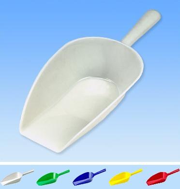 Material PP, lebensmittelecht, Länge: 400mm, Gewicht: 180g, Nutzlast: ca. 1800g, lieferbare Farben: weiß - blau - grün - gelb - rot, möglich ist eine ca. 3mm tiefe Prägung oder ein Druck auf der inneren Schaufelkante ab 500 Stück