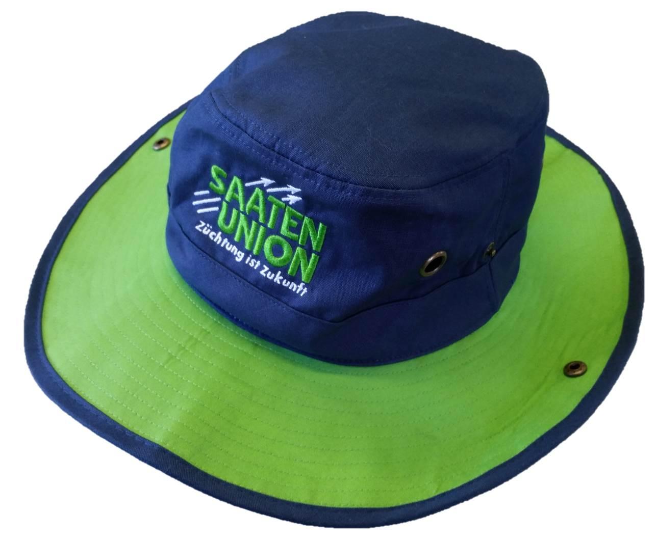 100% Baumwoll-Canvas in 2 Farben grün und blau, inklusive 2-farbiger Stickerei auf der Front in grün und weiß, Lüftungsösen, Druckknöpfe an den Seiten, Kordel mit Stopper, zu je 18 Stück im Polybeutel verpackt