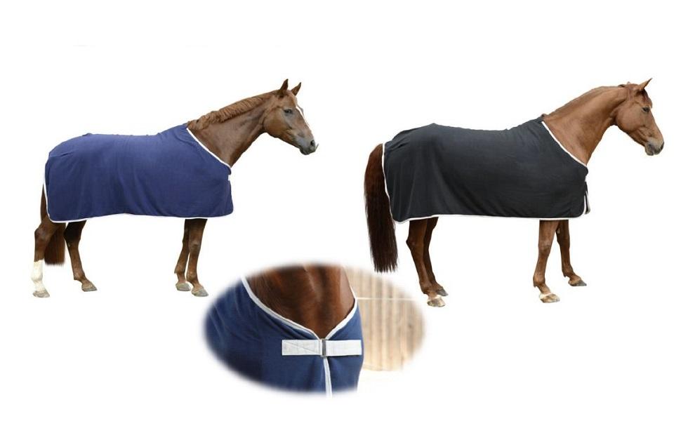 leichte Transport- und Abschwitzdecke aus Micro-Fleece, Widerristpolster aus Fleece, mit Brustverschnallung und Schweifriemen, Rückenlänge cm: 125 - 135 - 145 - 155cm, Farben: blau oder schwarz, individualisierbar durch Stick gegen Aufpreis.