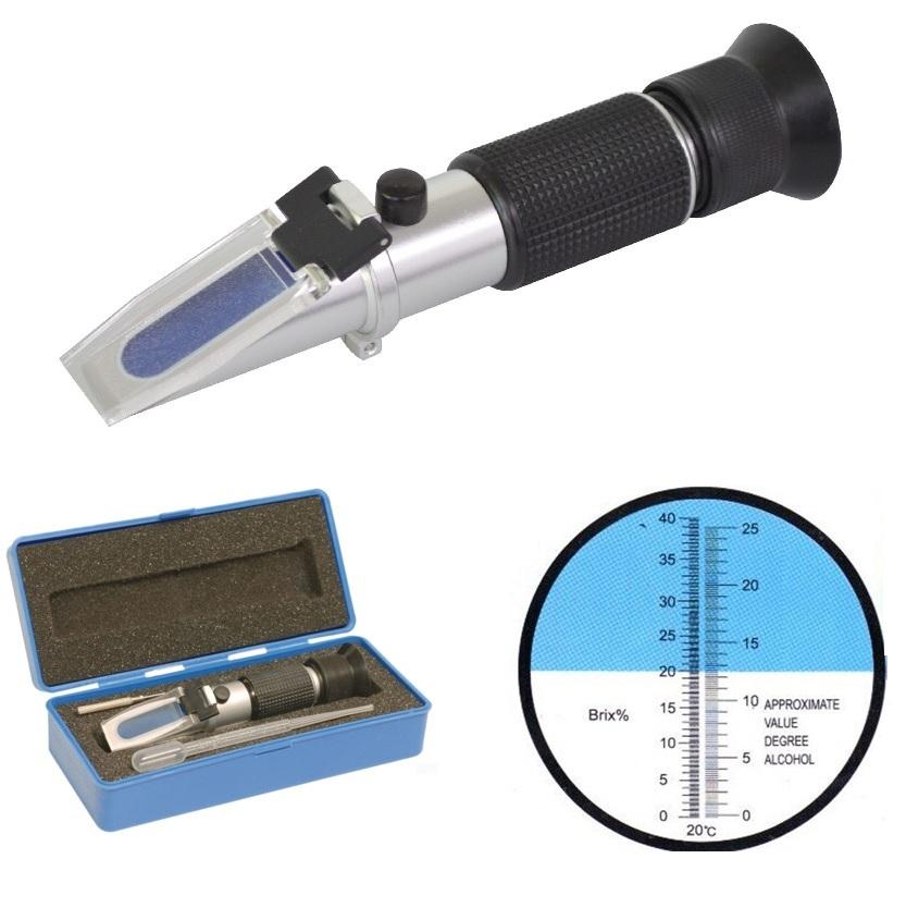 hochwertiges, optisches Prüfgerät zur einfachen und schnellen Messung von Wein oder anderen Flüssigkeiten, Messbereiche: Brix: 0-40%, Alkoholgehalt: 0,25%, Abweichungen möglich + / - 0,2%.