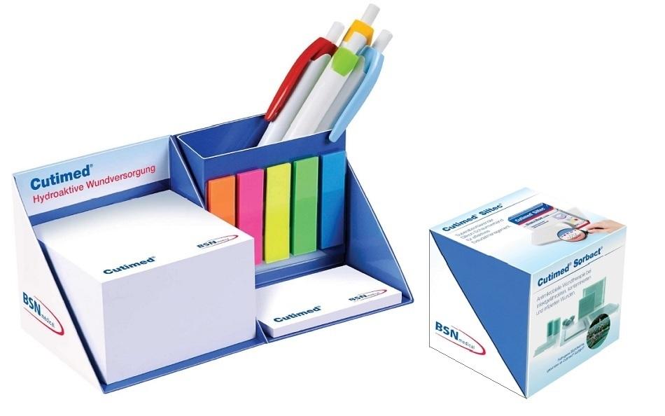| Artikelbeschreibung: patentgeschützer Artikel Größe geschlossen: 8x7,5x7,5cm inklusive 4/4c Druck, seitlich aufklappbar, links innen mit Notizblock - hinten geleimt, Größe: 72x65mm ca. 380 Blatt 1- bis2-farbig bedruckt, rechts innen Haftnotizen, Größe: 68x40mm - 25 Blatt 1- bis 2-farbig bedruckt, Indexstreifen 12x45mm [5 Farben a´ 25 Stück], Stifteköcher, einzeln eingeschweißt Die Hardcover-Modelle erhalten zum Schutz eine Folienkaschierung, diese ist standardmäßig glänzend. Preis inklusive Nebenkosten bei Anlieferung druckfähiger Daten Die verfügbaren Techniken und Größenangaben der Individualisierung erläutern wir Ihnen sehr gern auf Anfrage. Staffelpreise*: |