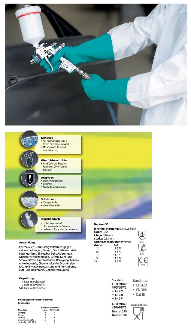 | Artikelbeschreibung: geraute Handfläche und Finger mit Pyramiden-Oberfläche für besten Griff, 33cm lang, 0,38mm stark, hochwertiges Nitril mit oder ohne Baumwoll-Innenbeflockung, allerbeste Abriebresistenz, silikonfrei, lebensmittel geeignet, Inhalt: 1 Paar im Polybeutel - 12 Paar im Umbeutel - 144 Paar im Umkarton, Größen S - M - L - XL - XXL, Farbe grün Anwendung: Chemikalien- und Flüssigkeitsschutz gegen zahlreiche Laugen - Säuren - Öle - Fette - viele Lösungsmittel, einsetzbar bei Lackierungen - Oberflächenbehandlungen - Beizungen - bei Kühl- und Schmierstoffen, in Druckereien, der Lebensmitte- und Chemielindustrie. Lieferzeit nach Auftragsklarheit ca. 1-2 Wochen, Lagerbestand vorausgesetzt eine Individualisierung kann nur über ein Aufkleber, der nachträglich auf den Polybeutel geklebt wird, erreicht werden Preis auf Anfrage Die verfügbaren Techniken und Größenangaben der Individualisierung erläutern wir Ihnen sehr gern auf Anfrage. Staffelpreise*: |
