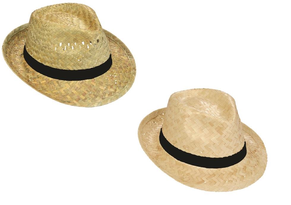 Material: Schilfstroh (hell) oder Palmstroh (dunkel), lieferbar in den Größen S - M - L, individualisierbares Hutband aus Polyester, das Hutband wird auf dem Hut festgenäht, Farbe weiß, inklusive bis zu 4-farbigen Rotationsdruck.
